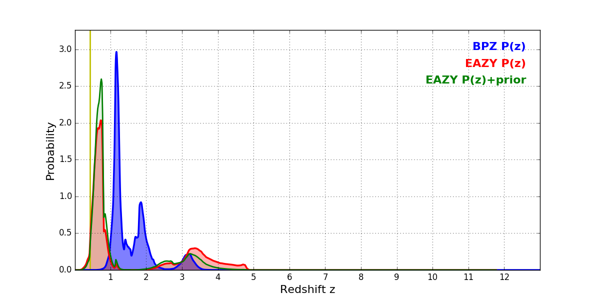 In P(z) plots: Yellow lines mark the cluster redshift z = 0.425,