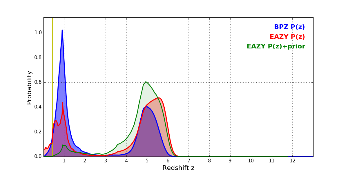 In P(z) plots: Yellow lines mark the cluster redshift z = 0.425,