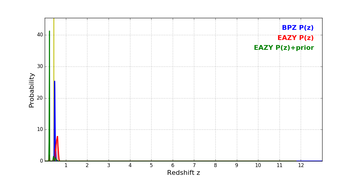 In P(z) plots: Yellow lines mark the cluster redshift z = 0.425,