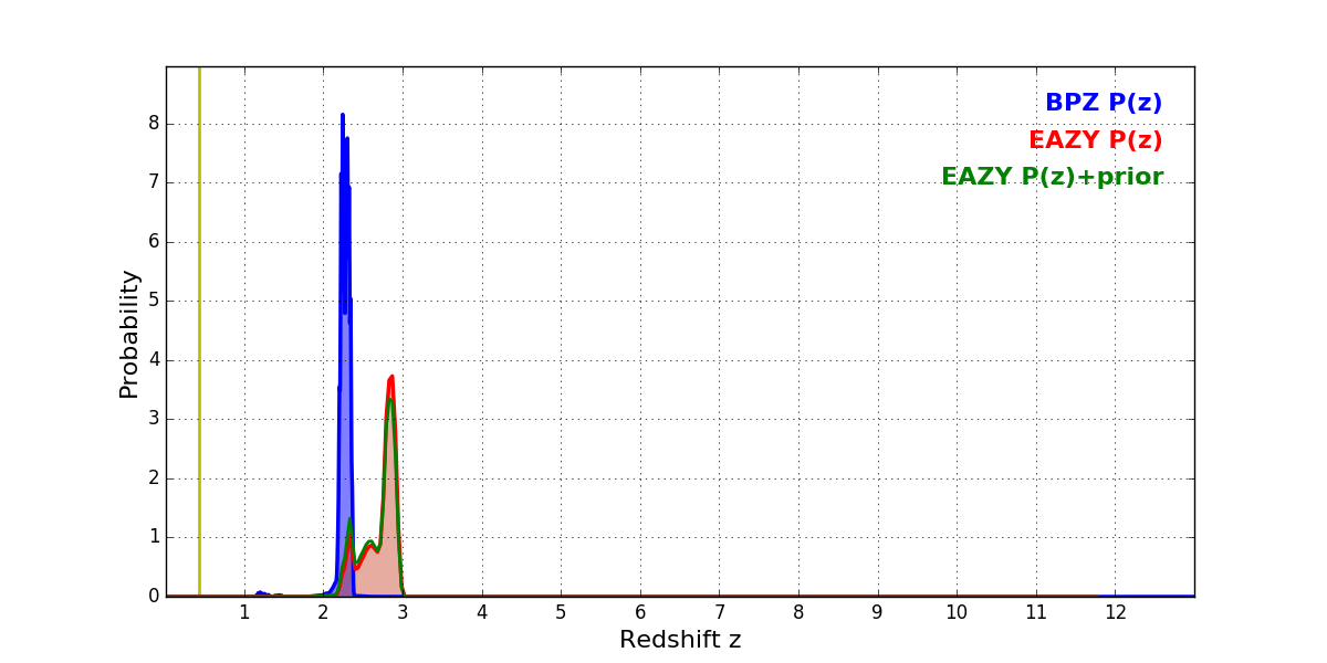In P(z) plots: Yellow lines mark the cluster redshift z = 0.425,