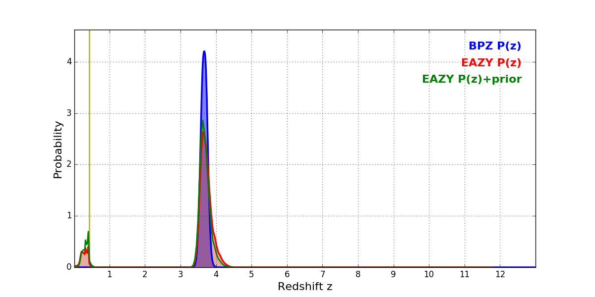 In P(z) plots: Yellow lines mark the cluster redshift z = 0.425,
