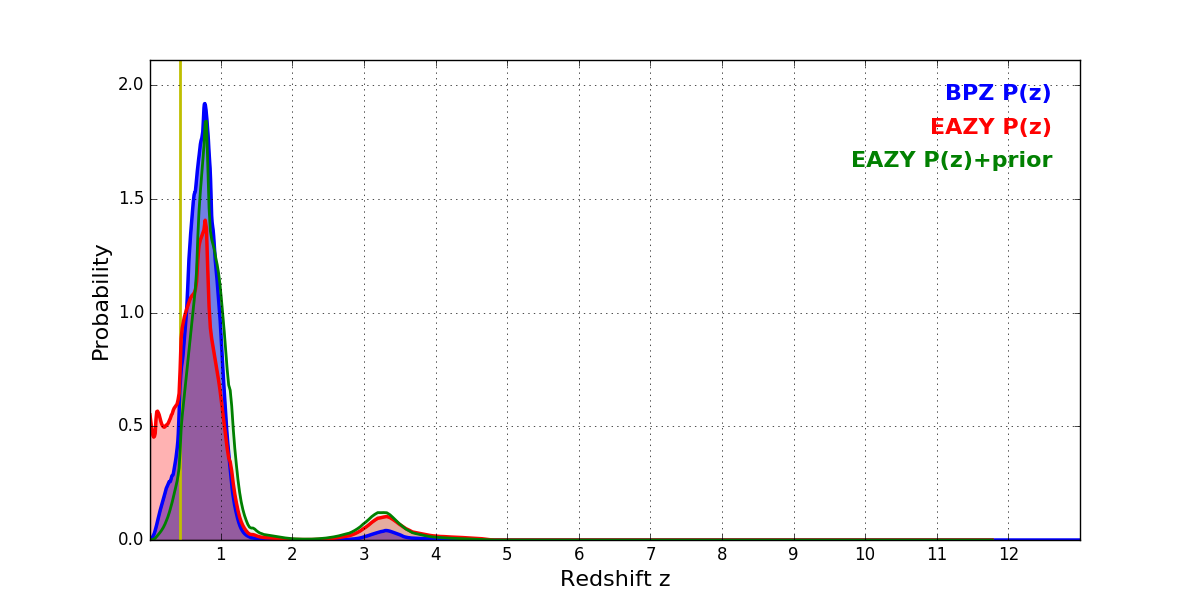 In P(z) plots: Yellow lines mark the cluster redshift z = 0.425,