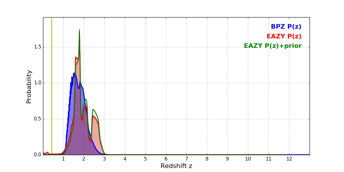 In P(z) plots: Yellow lines mark the cluster redshift z = 0.425,