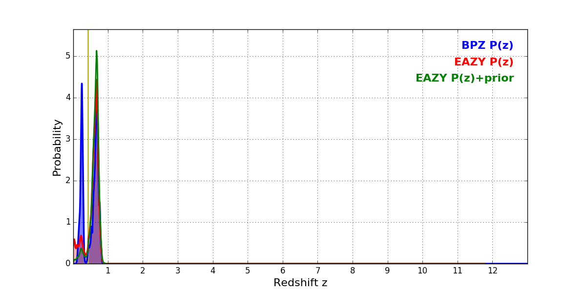 In P(z) plots: Yellow lines mark the cluster redshift z = 0.425,