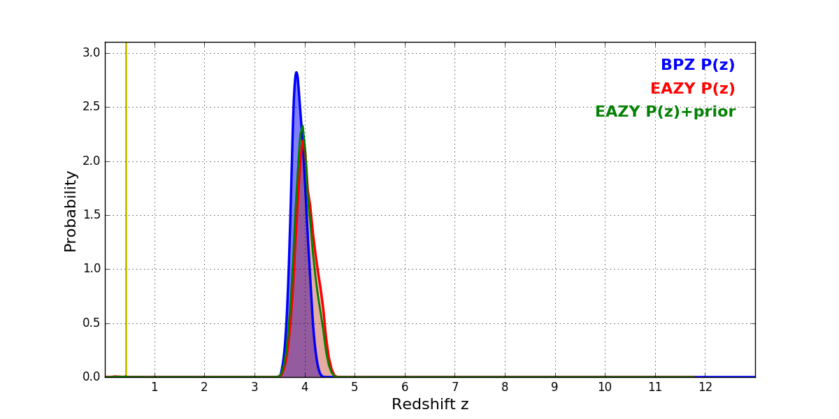 In P(z) plots: Yellow lines mark the cluster redshift z = 0.425,
