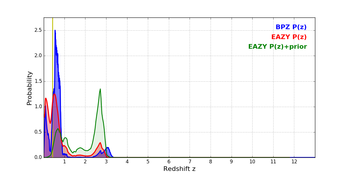 In P(z) plots: Yellow lines mark the cluster redshift z = 0.425,