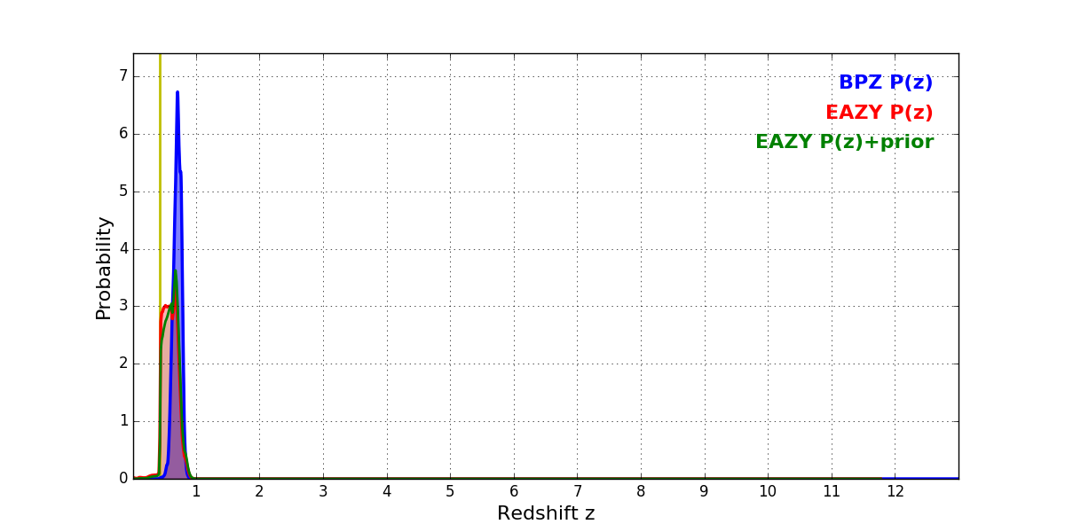 In P(z) plots: Yellow lines mark the cluster redshift z = 0.425,