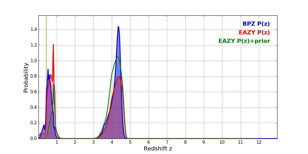 In P(z) plots: Yellow lines mark the cluster redshift z = 0.425,