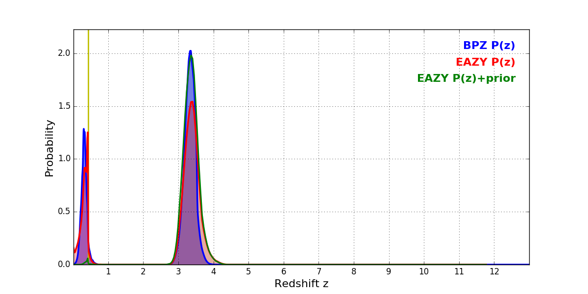 In P(z) plots: Yellow lines mark the cluster redshift z = 0.425,