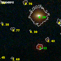 Object #16774 x,y = (2626, 4684) RA, Dec = (04:54:14.976, 02:56:33.00) = (73.56240, 2.94250) BPZ = 0.297 [0.112--4.076] type = 10.00 (SB3_B10) chisq2 = 0.47 ODDS = 0.15 z_cluster = 0.203