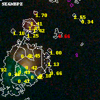 Object #9633 x,y = (1895, 3557) RA, Dec = (04:54:17.904, 02:55:25.68) = (73.57460, 2.92380) BPZ = 1.003 [0.118--1.227] type = 8.40 (SB1_B10 - SB2_B10) chisq2 = 0.47 ODDS = 0.29 z_cluster = 0.203