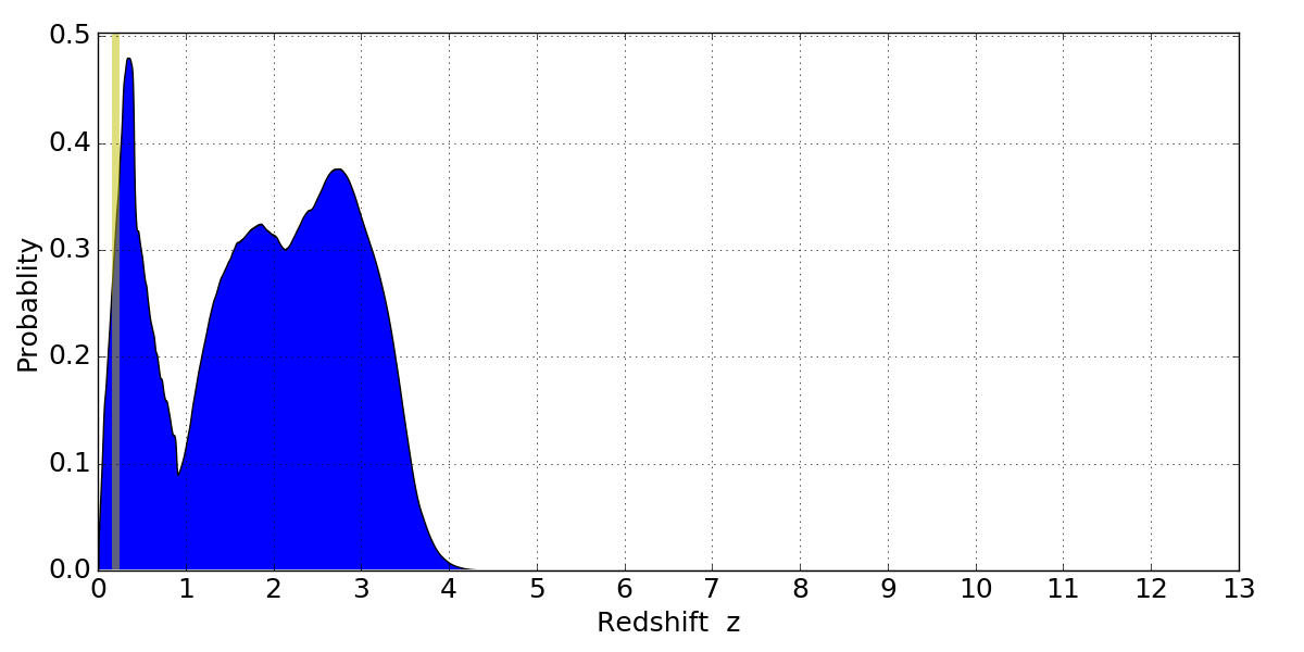 In P(z) plots: Yellow lines mark the cluster redshift z = 0.203,