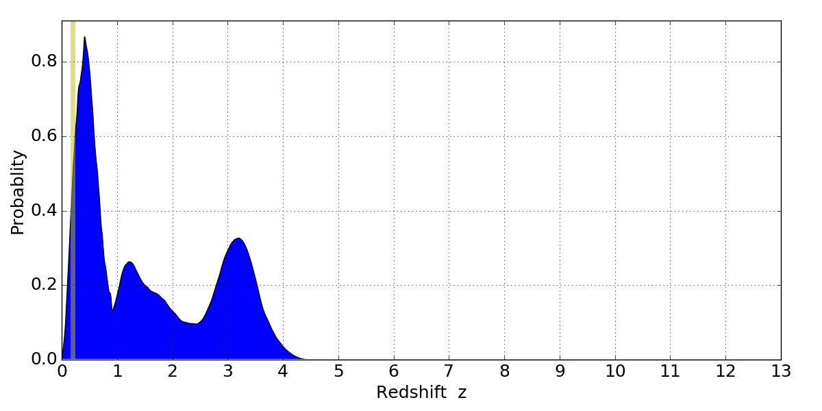 In P(z) plots: Yellow lines mark the cluster redshift z = 0.203,