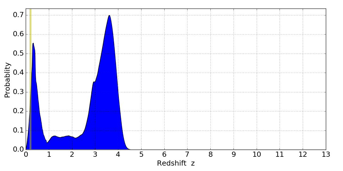 In P(z) plots: Yellow lines mark the cluster redshift z = 0.203,