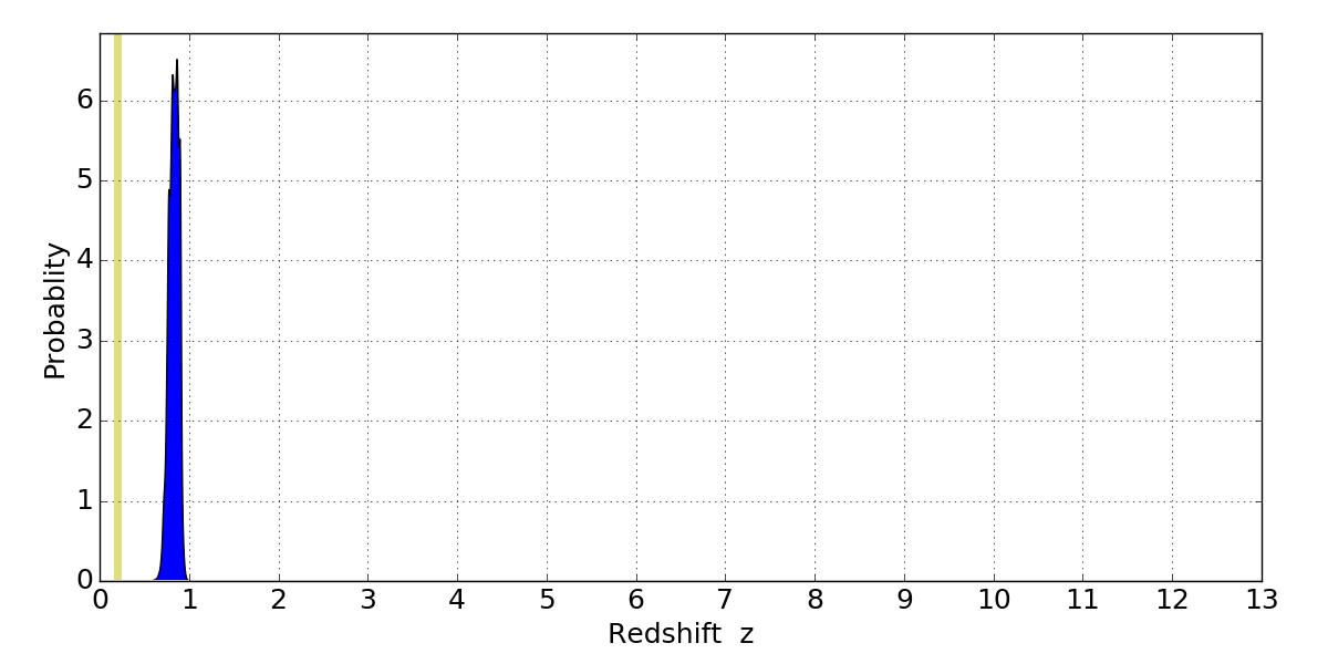 In P(z) plots: Yellow lines mark the cluster redshift z = 0.203,