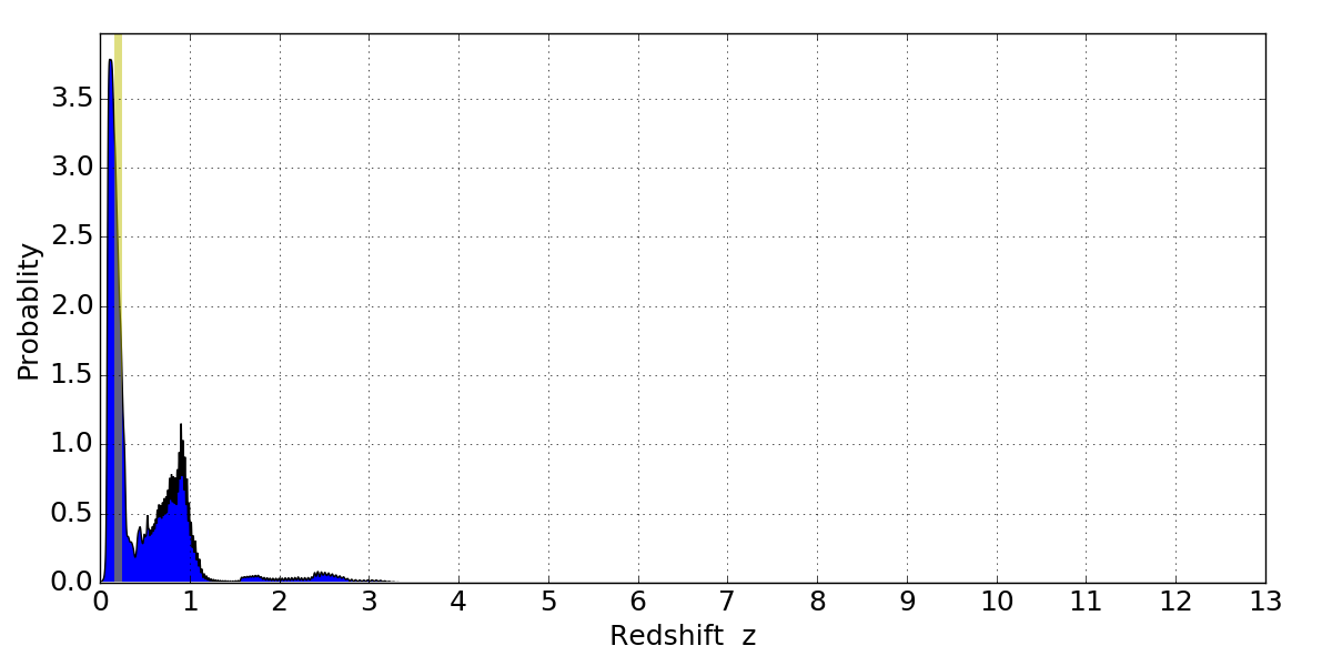 In P(z) plots: Yellow lines mark the cluster redshift z = 0.203,