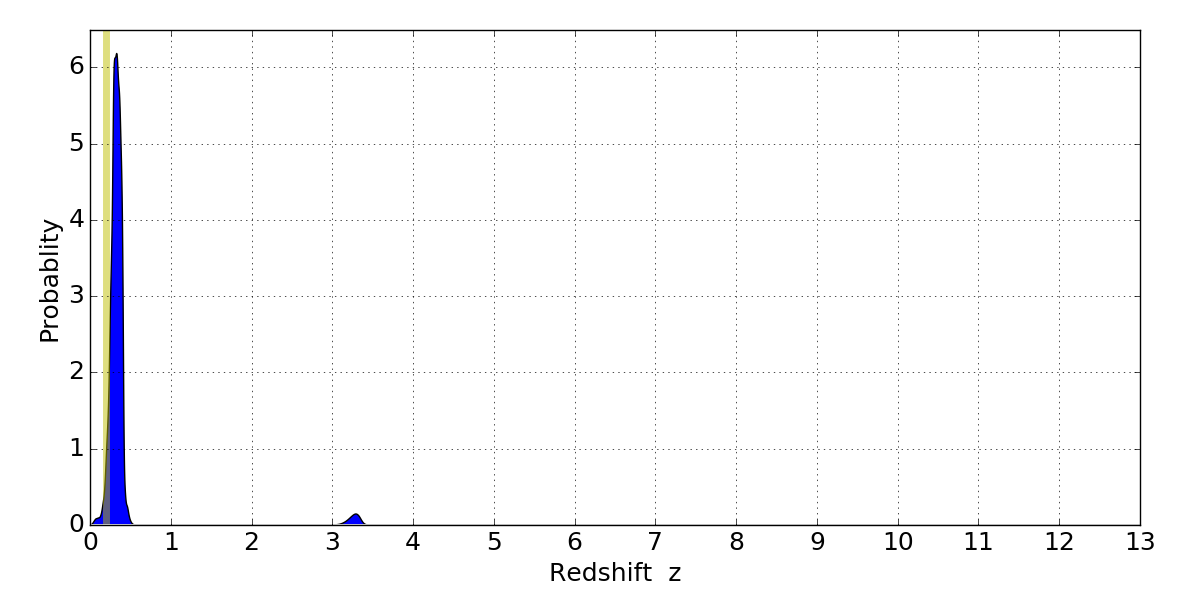 In P(z) plots: Yellow lines mark the cluster redshift z = 0.203,