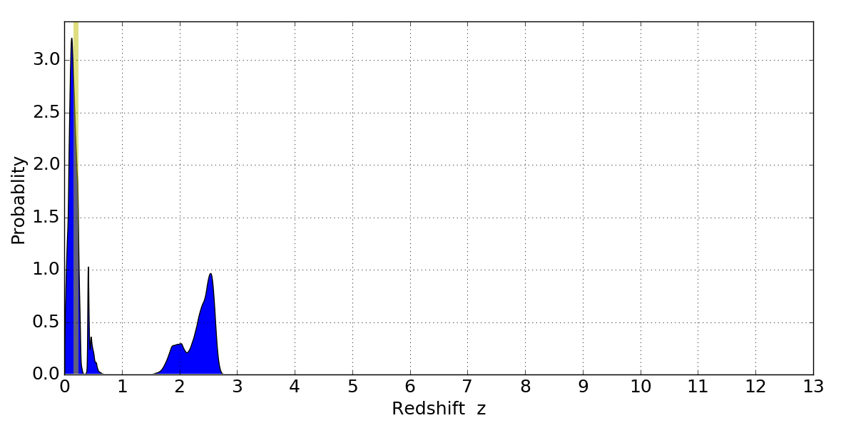 In P(z) plots: Yellow lines mark the cluster redshift z = 0.203,