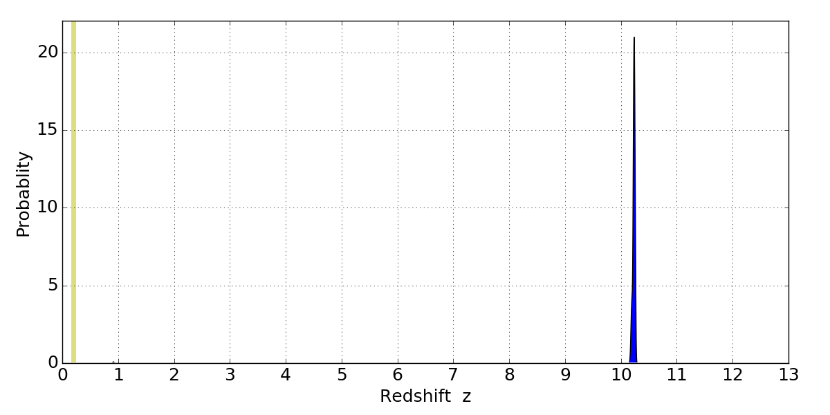 In P(z) plots: Yellow lines mark the cluster redshift z = 0.203,