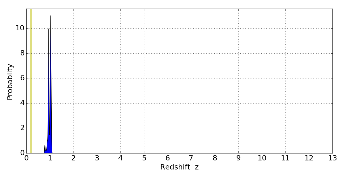 In P(z) plots: Yellow lines mark the cluster redshift z = 0.203,