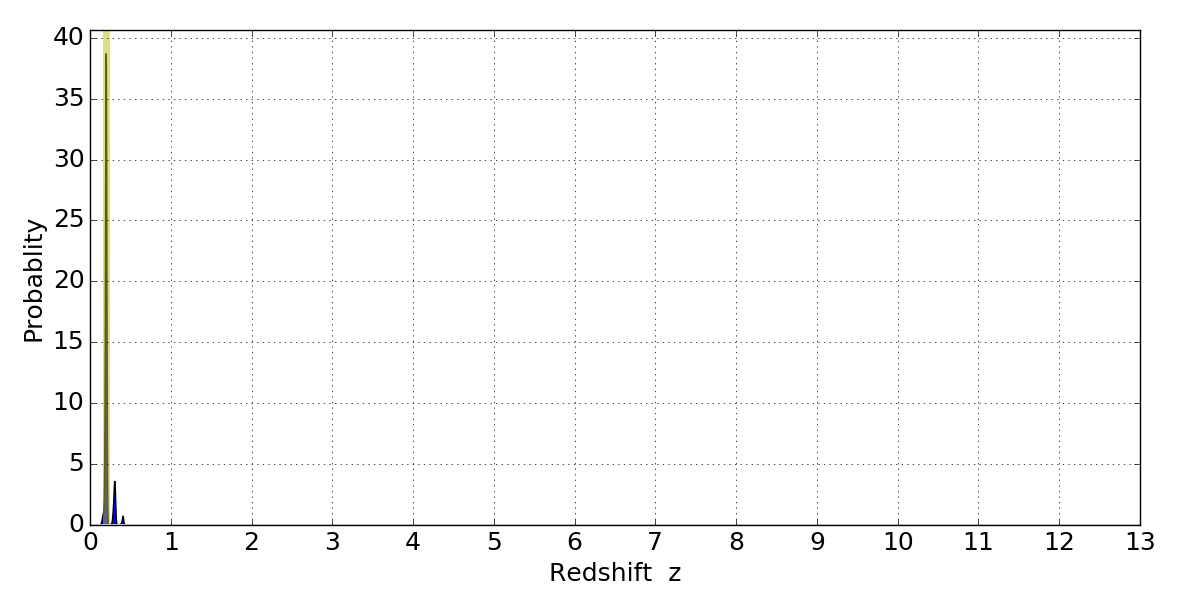 In P(z) plots: Yellow lines mark the cluster redshift z = 0.203,