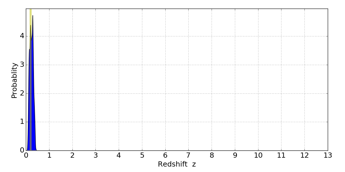 In P(z) plots: Yellow lines mark the cluster redshift z = 0.203,