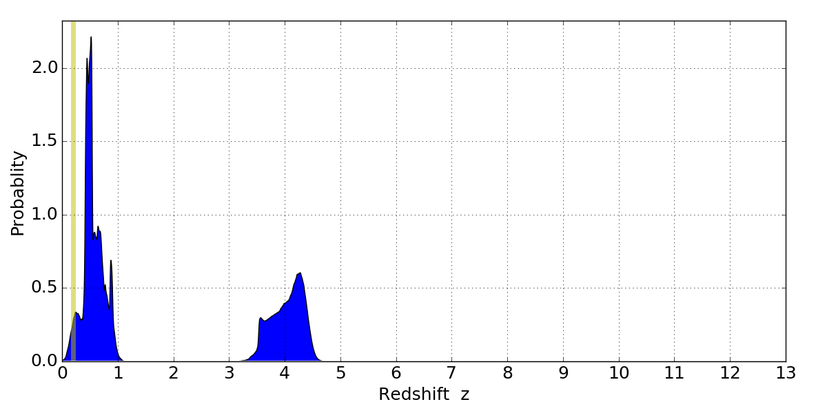 In P(z) plots: Yellow lines mark the cluster redshift z = 0.203,