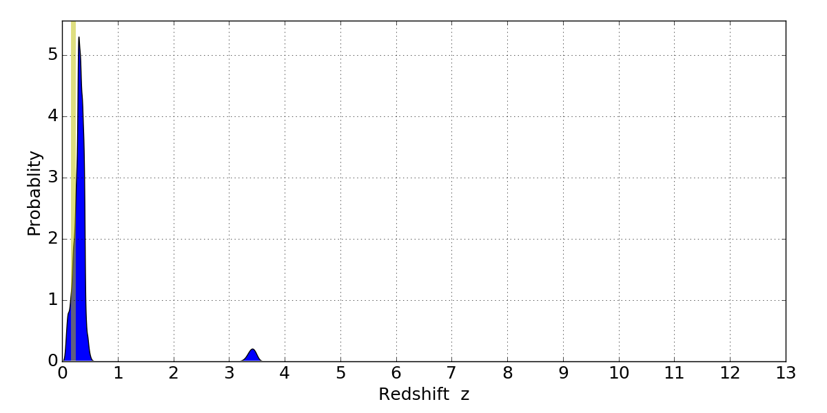 In P(z) plots: Yellow lines mark the cluster redshift z = 0.203,