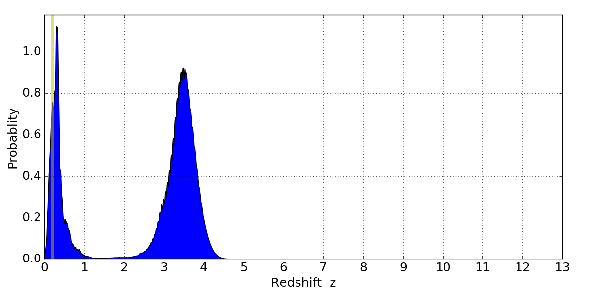 In P(z) plots: Yellow lines mark the cluster redshift z = 0.203,