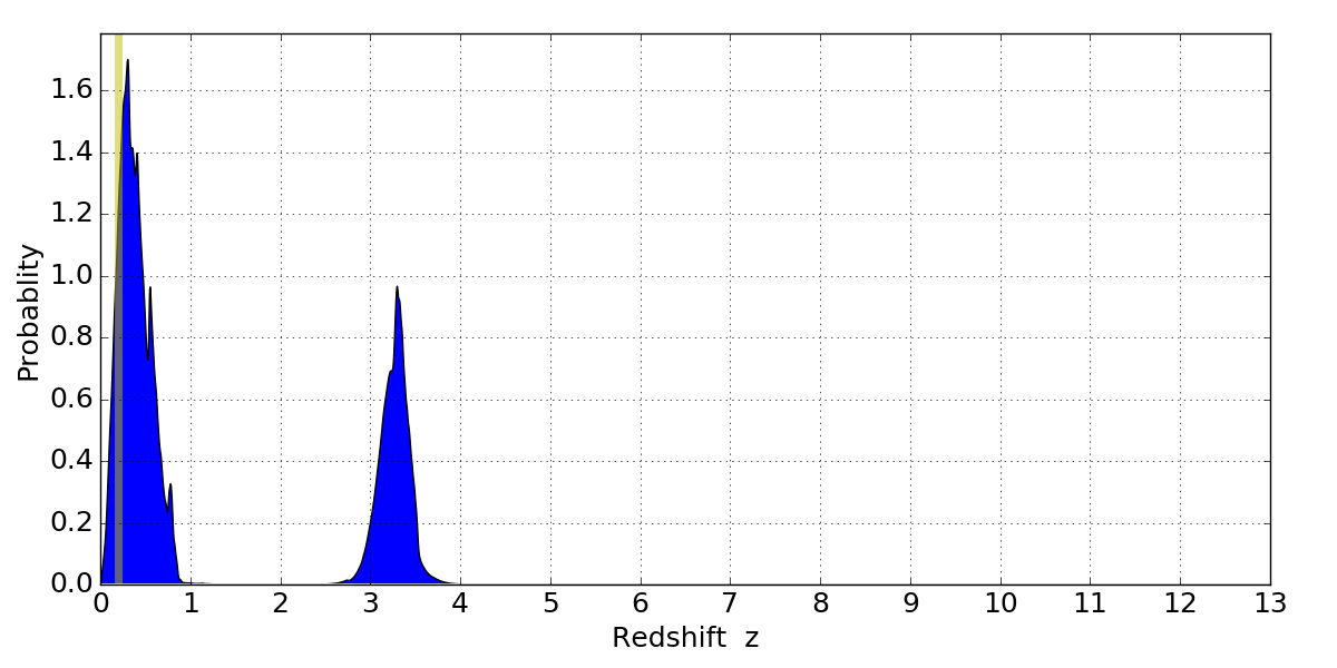 In P(z) plots: Yellow lines mark the cluster redshift z = 0.203,