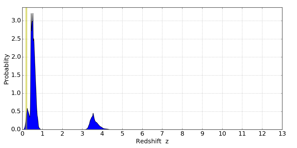 In P(z) plots: Yellow lines mark the cluster redshift z = 0.203,