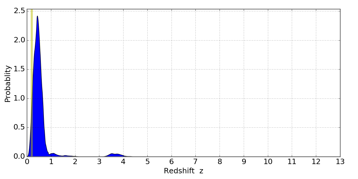 In P(z) plots: Yellow lines mark the cluster redshift z = 0.203,
