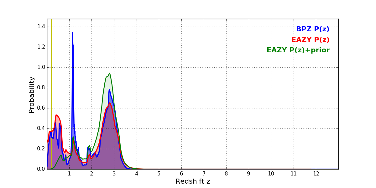 In P(z) plots: Yellow lines mark the cluster redshift z = 0.203,
