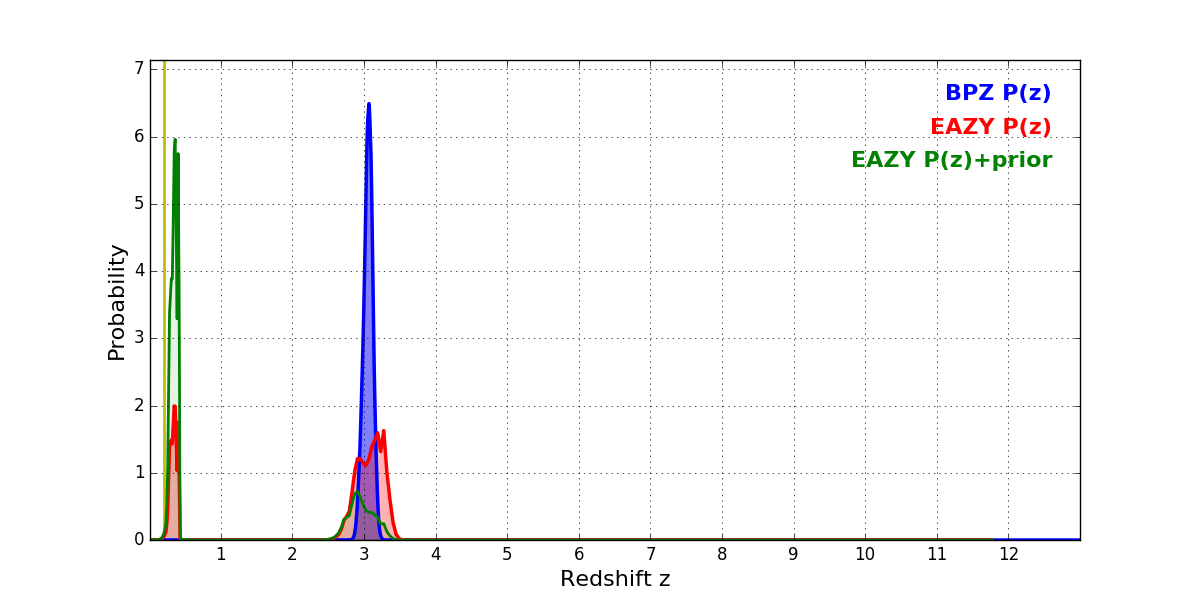 In P(z) plots: Yellow lines mark the cluster redshift z = 0.203,