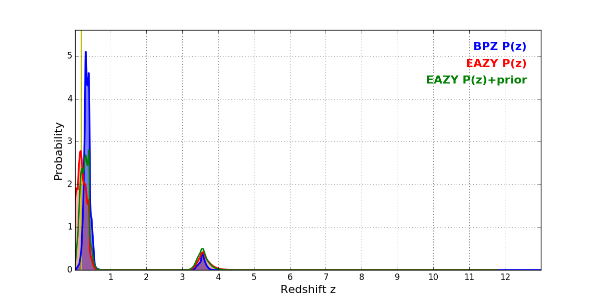In P(z) plots: Yellow lines mark the cluster redshift z = 0.182,