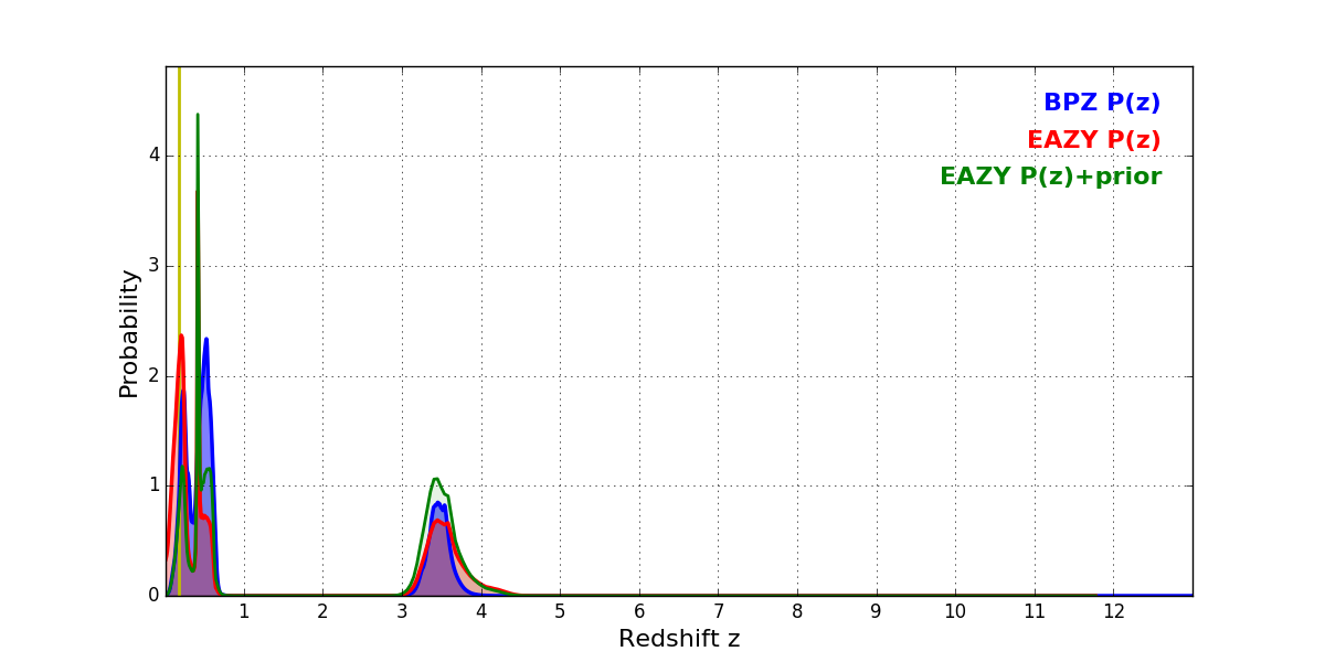 In P(z) plots: Yellow lines mark the cluster redshift z = 0.182,