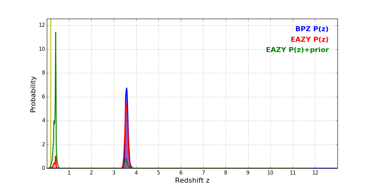 In P(z) plots: Yellow lines mark the cluster redshift z = 0.182,