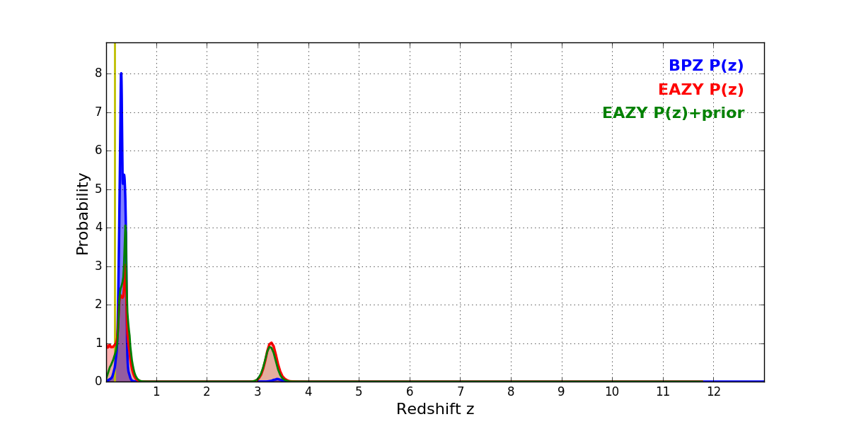 In P(z) plots: Yellow lines mark the cluster redshift z = 0.182,