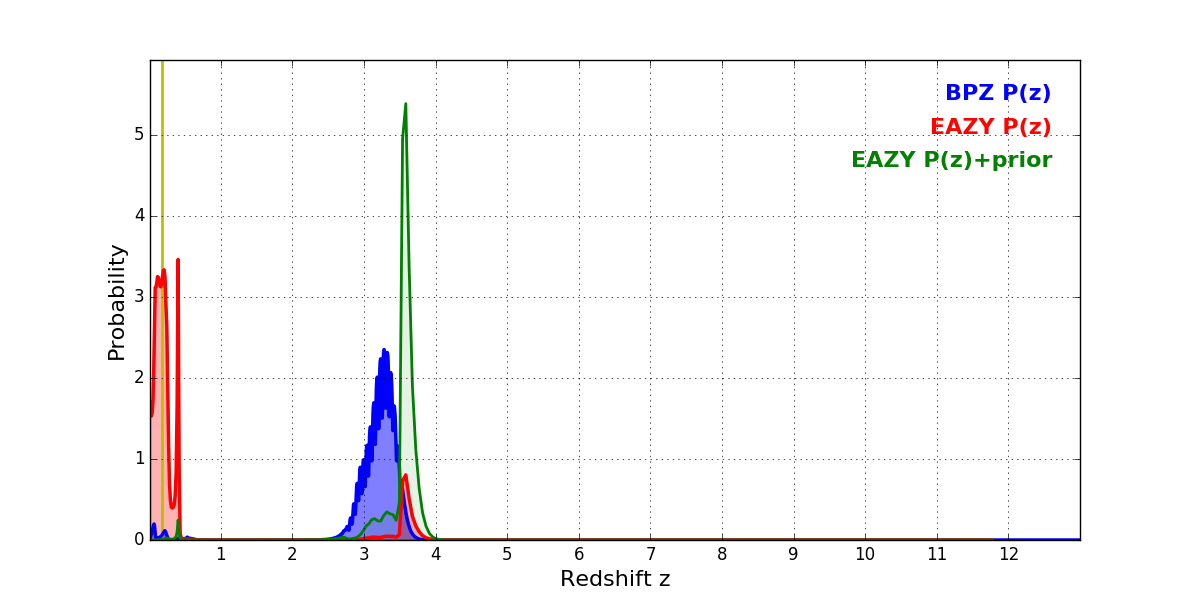 In P(z) plots: Yellow lines mark the cluster redshift z = 0.182,