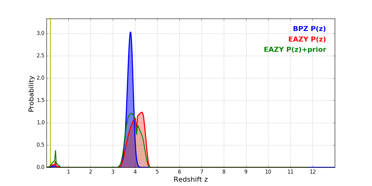 In P(z) plots: Yellow lines mark the cluster redshift z = 0.182,