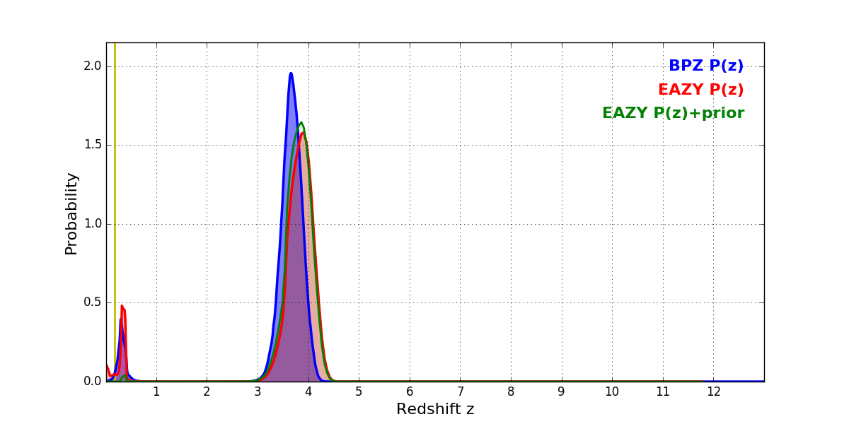 In P(z) plots: Yellow lines mark the cluster redshift z = 0.182,