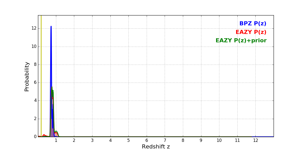 In P(z) plots: Yellow lines mark the cluster redshift z = 0.182,