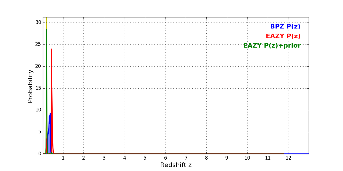 In P(z) plots: Yellow lines mark the cluster redshift z = 0.182,