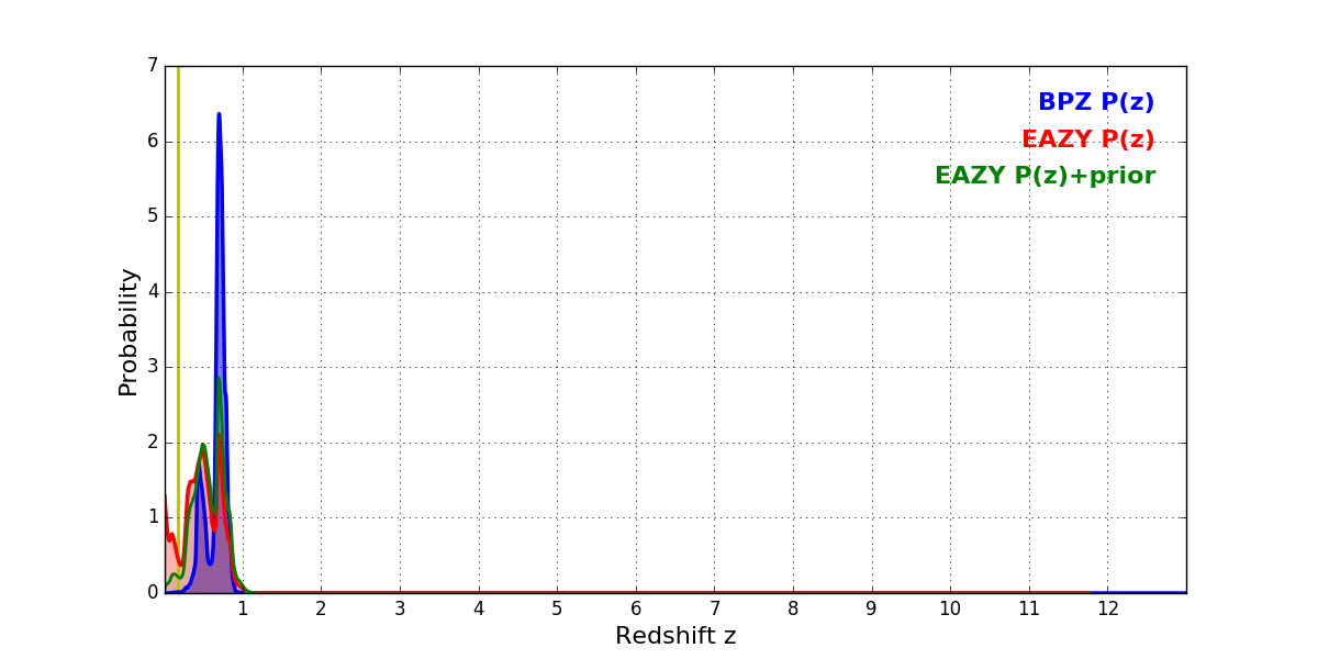 In P(z) plots: Yellow lines mark the cluster redshift z = 0.182,