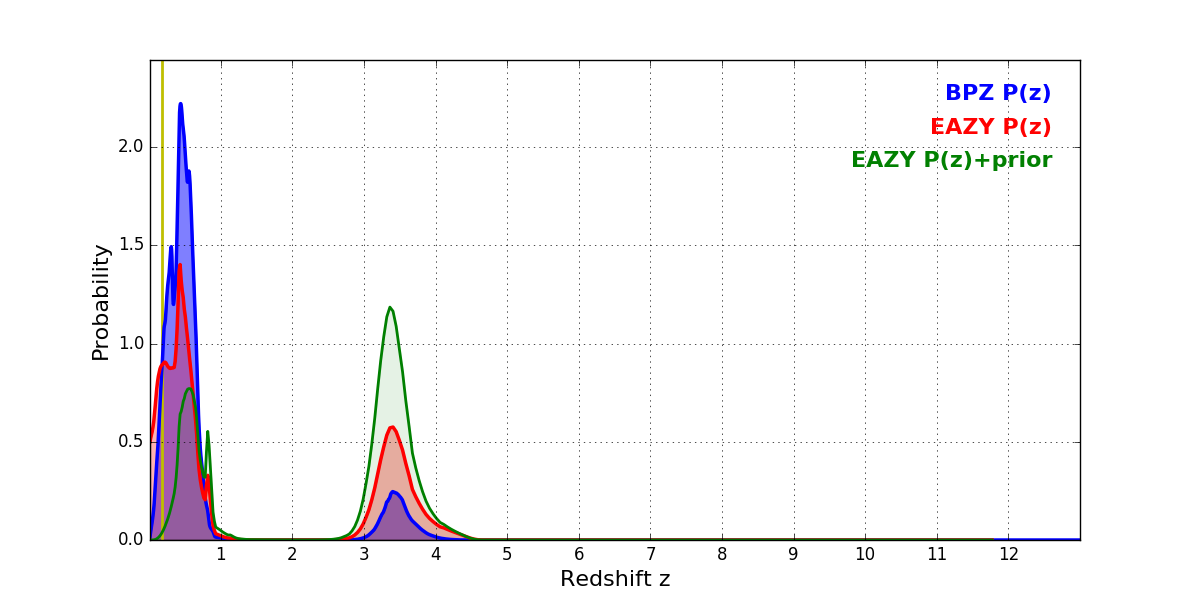 In P(z) plots: Yellow lines mark the cluster redshift z = 0.182,
