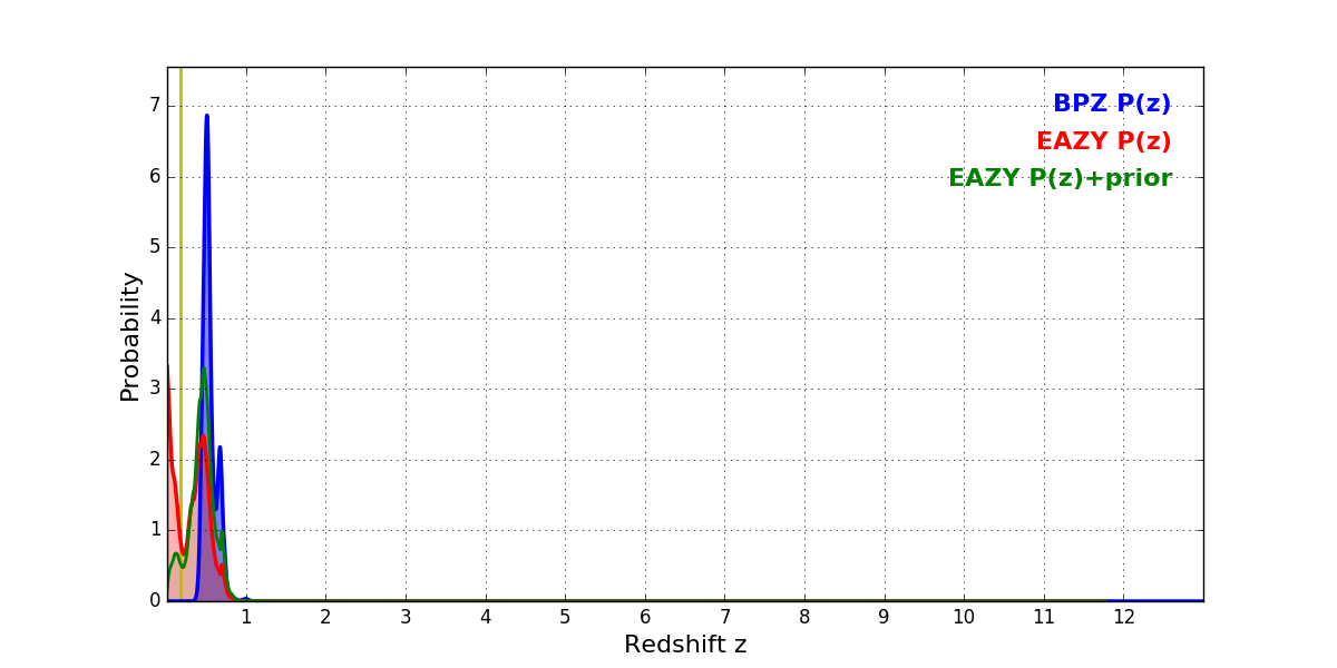 In P(z) plots: Yellow lines mark the cluster redshift z = 0.182,