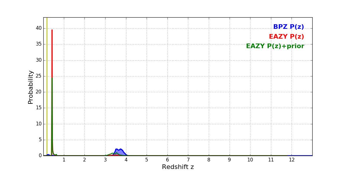 In P(z) plots: Yellow lines mark the cluster redshift z = 0.182,