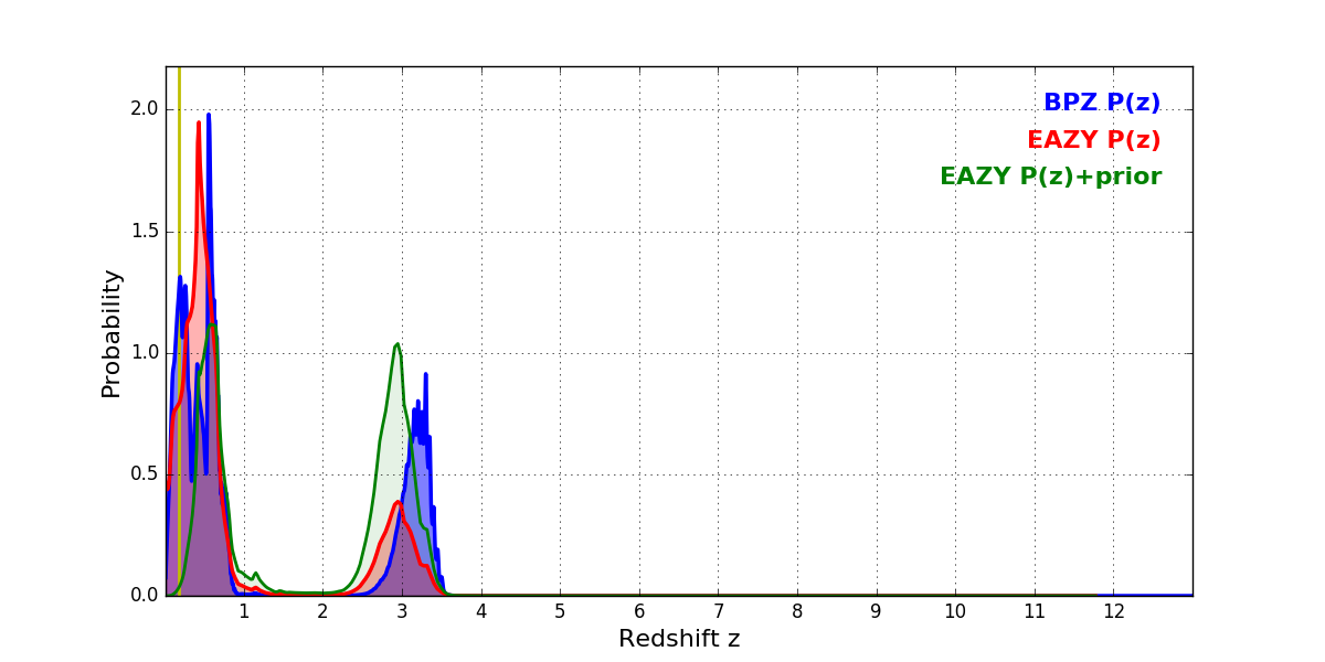 In P(z) plots: Yellow lines mark the cluster redshift z = 0.182,