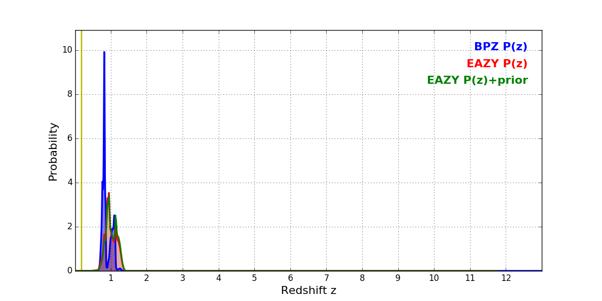 In P(z) plots: Yellow lines mark the cluster redshift z = 0.182,