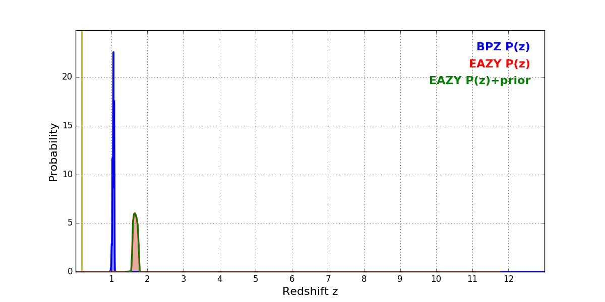 In P(z) plots: Yellow lines mark the cluster redshift z = 0.182,